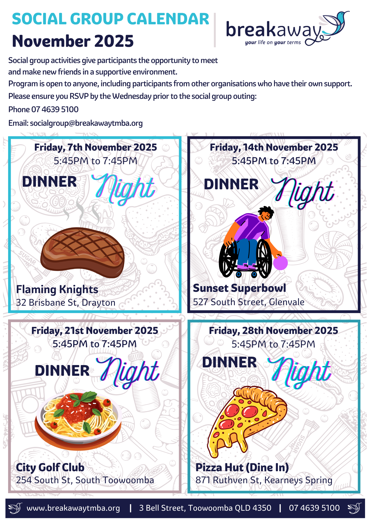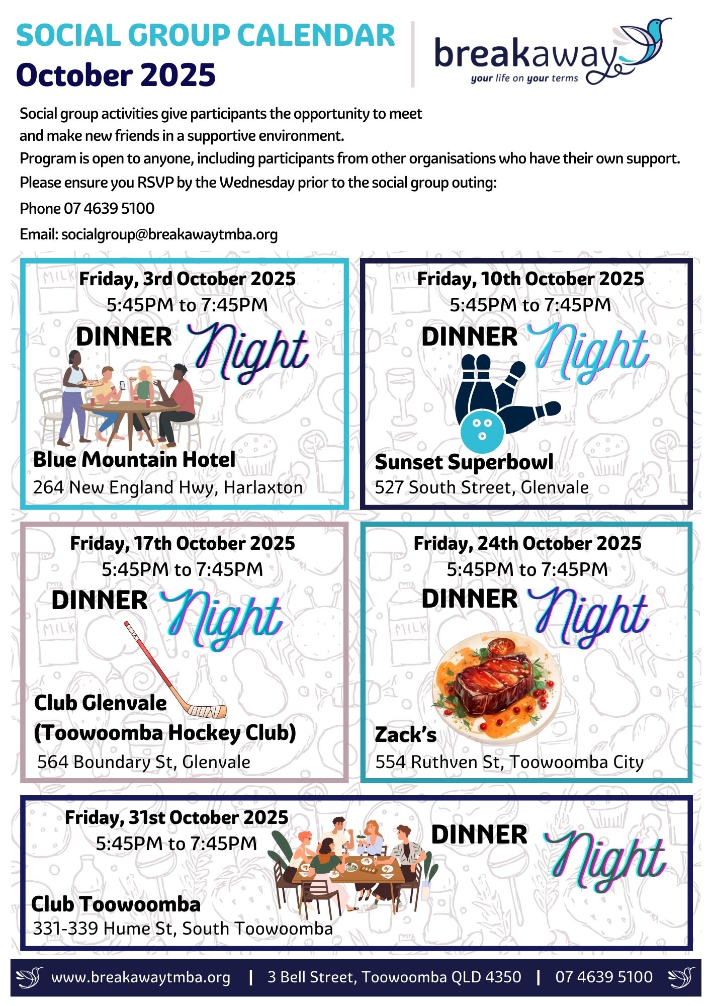 Breakaway holds a Social Group every Friday night. Social Group activities give participants the opportunity to meet and make new friends in a supportive environment.